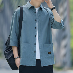 夏季新款纯棉七分袖衬衫男士港风休闲工装纯色衬衣外套宽松韩版潮