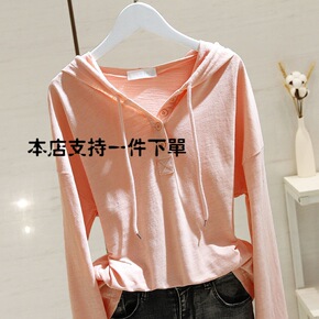 2021春季新款T恤女修身长袖内搭打底衫黑色运动洋气紧身连帽上衣