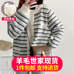 条纹毛呢外套女复古圆领针织开衫冬加厚小香风毛衣仿貂绒韩版上衣