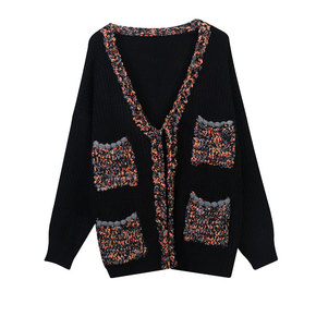 毛衣女秋冬2022新款针织开衫 条纹口袋拼接暗扣V领长袖中长款外套