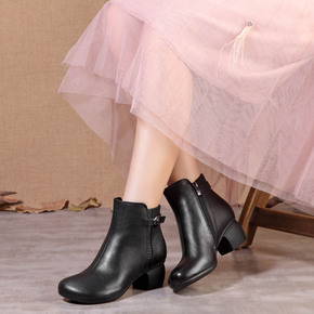 With one layer of cow leather, soft sole, middle heel, short boots, national style, retro round head women's boots, spring and autumn new single boots, women's Boots