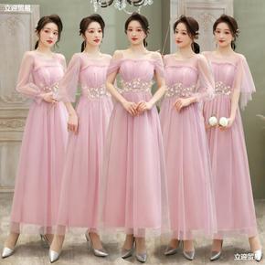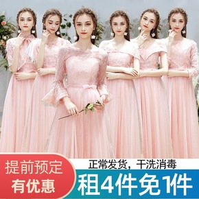 出租粉色伴娘服2021冬季新款长袖一字简约大气显瘦...