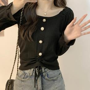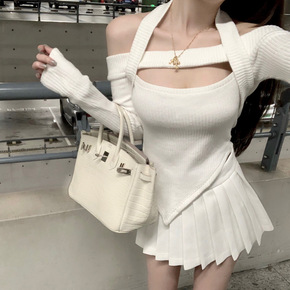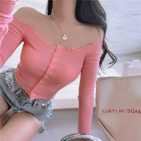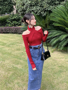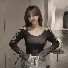 3636#秋季新款修身性感一字肩交叉挂脖显瘦针织衫...