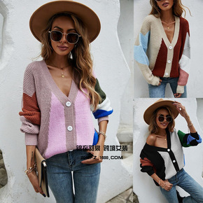 2020冬装新款亚马逊毛开衫外贸拼接多色开衫针织衫...