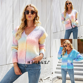 2021冬季新款跨境女式毛衣彩虹扎染开衫针织大码木...