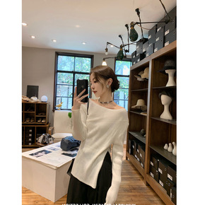 春夏性感露肩时尚针织衫女镂空长袖秋时尚宽松薄款珍珠...