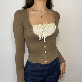 SX善喜卡其色交叉一字领露锁骨性感设计感小众长袖T...