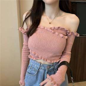 3682港味复古风一字肩挂脖修身显瘦露肩设计感高腰...