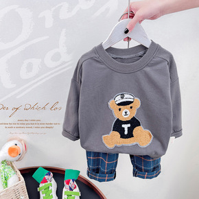 小童卡通小熊毛巾绣圆领长袖两件套春季新款宝宝棉卫衣...