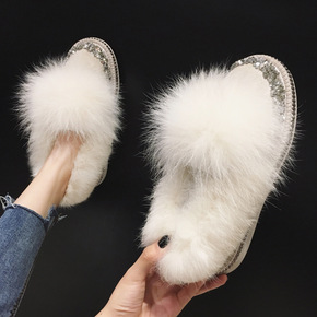 网红爆款串珠羔毛毛鞋女冬外穿2021年新款白色加绒...
