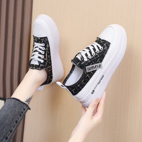 小香风2022年新款网红系带小白鞋女一脚蹬帆布平底...