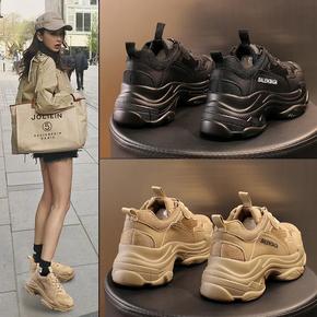 真皮2021秋季新厚底增高ins爆款黑色老爹鞋女运...