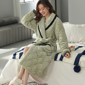 睡袍女冬加厚中长款三层夹棉珊瑚绒浴袍女士青绿色冬加...