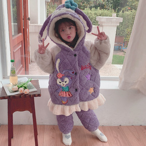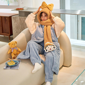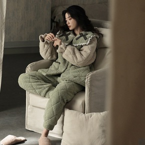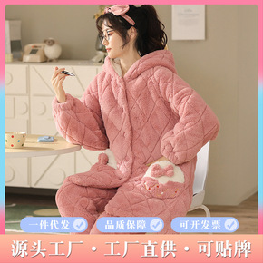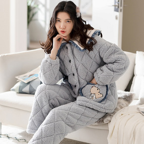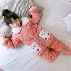 冬季睡衣女甜美大码学生三层夹棉保暖珊瑚绒女士可外穿...