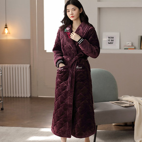 睡袍女冬加厚中长款三层夹棉珊瑚绒浴袍女士奢华冬天加...