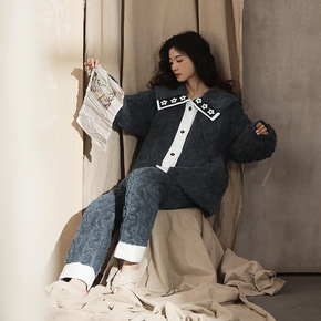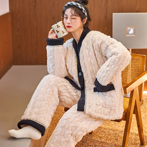 睡衣女冬季新款珊瑚绒三层夹棉保暖简约法兰绒女士家居...