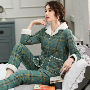 睡衣女冬季三层加厚加棉加绒珊瑚绒夹棉袄孕妇大码托腹...