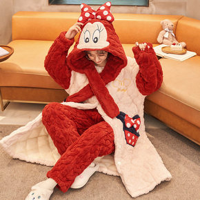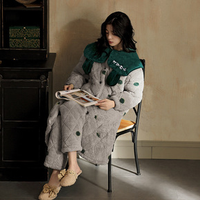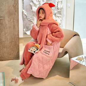 睡袍女冬加厚中长款三层夹棉珊瑚绒浴袍女士可爱冬天加...