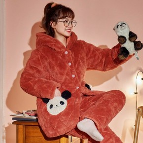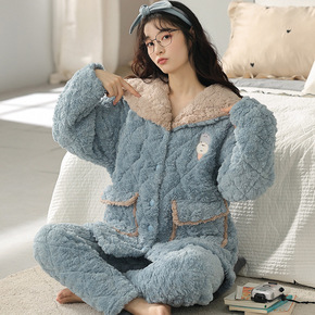 睡衣女秋冬季珊瑚绒加厚加绒保暖三层夹棉法兰绒可外穿...