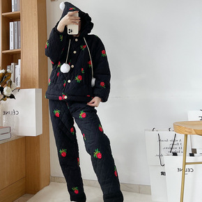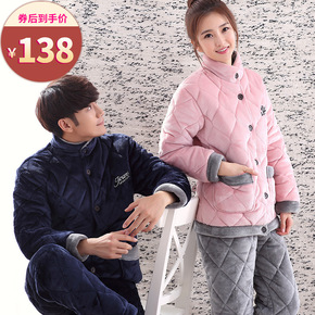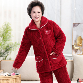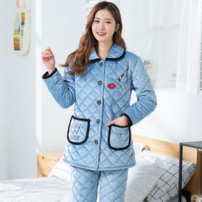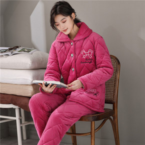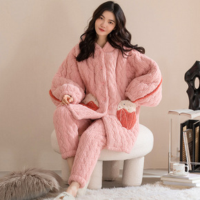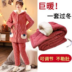 女士冬季三层加厚珊瑚绒夹棉睡衣冬天法兰绒保暖棉袄套...