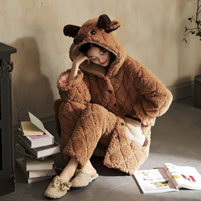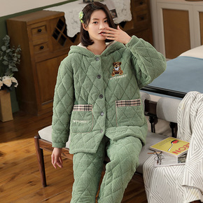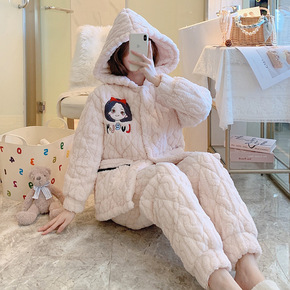 三层夹棉珊瑚绒保暖加厚加绒北方睡衣女可外穿套装连帽...