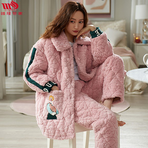 美芬伴冬季加厚长毛绒提花三层夹棉睡衣女士法兰绒长袖...