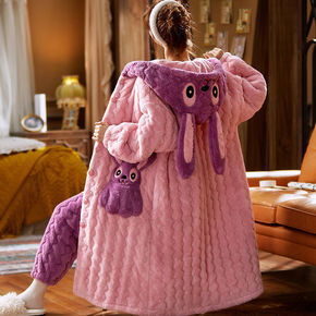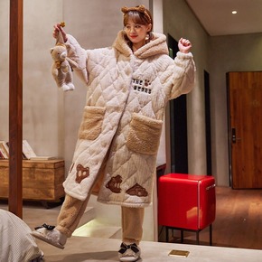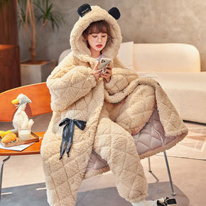 加厚三层夹棉睡袍套装长款珊瑚绒睡衣女生秋冬季天可爱...