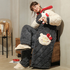 冬季三层夹棉睡衣女秋冬保暖加厚法兰绒卡通可爱家居服...