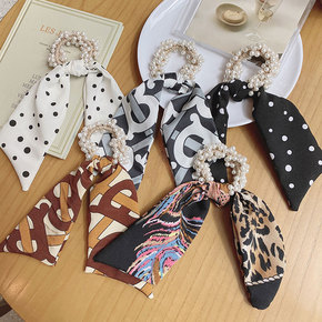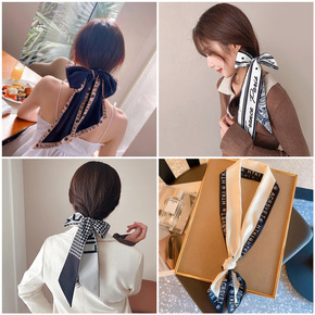 法式千鸟格丝巾发带女绑发编发珍珠蝴蝶结飘带森系扎马...