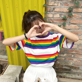 2022年新款春秋彩虹条纹长袖t恤女女装韩版宽松学...