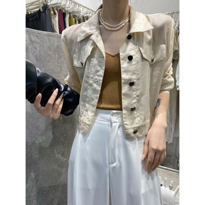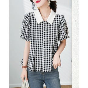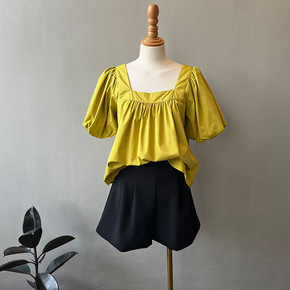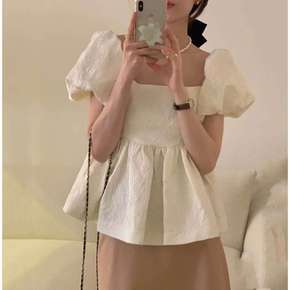 2022新款法式方领泡泡袖衬衫宽松短款花朵纹理荷叶...