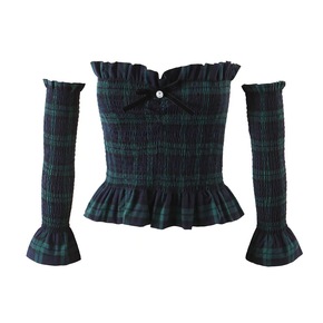 辣妹褶皱绿色格子上衣两件套ins欧美风复古套袖松紧...