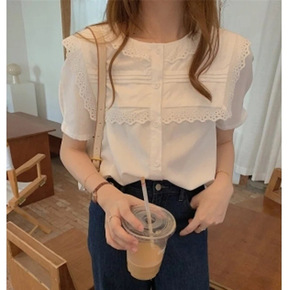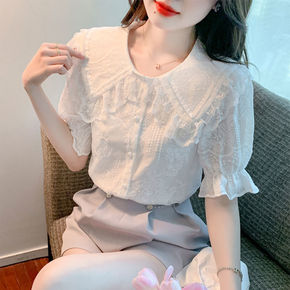 2022夏季新款洋气娃娃领重工甜美小清新蕾丝衫上衣...