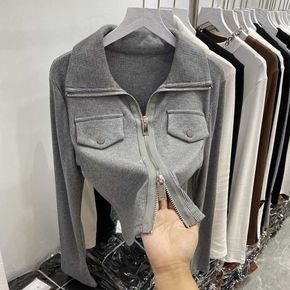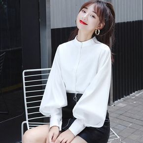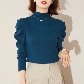 2021秋装新款泡泡袖上衣女长袖修身t恤时尚纯色半...