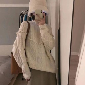 韩国东大门冬季新款甜美圆领软糯蕾丝边打底针织衫女长...