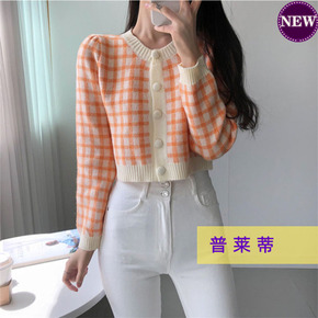 东大门棋盘格针织开衫女 秋冬新款小个子单排扣修身...