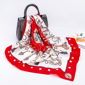 春夏薄款皮扣链丝巾真丝桑蚕丝印花米白色法式韩版欧美...