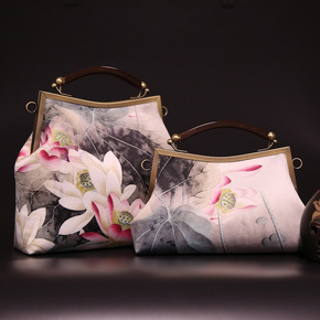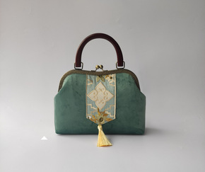 中式女包复古木柄丝绒素雅手提包绣片晚宴礼服包...