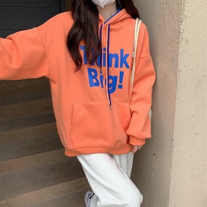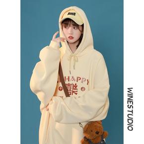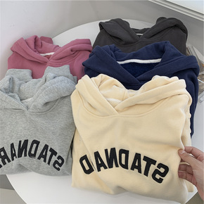 重工字母刺绣米妮绒加绒加厚连帽卫衣女帽衫冬米杏色保...
