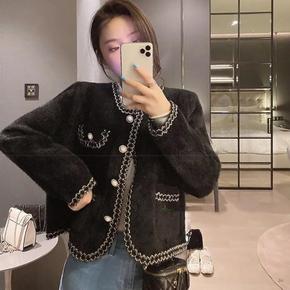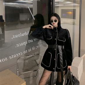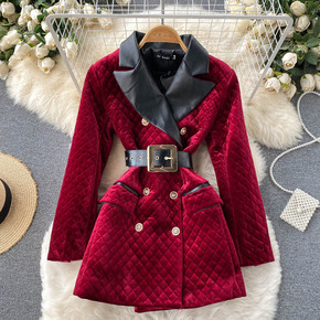 名媛小香风外套女复古丝绒拼皮西装领双排扣加厚保暖西...