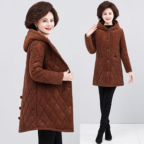 中老年灯芯绒棉袄新款妈妈棉衣中长款连帽条绒棉服女冬...