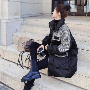 呢子外套女千鸟格棉服女2021年新款韩版宽松拼接小...