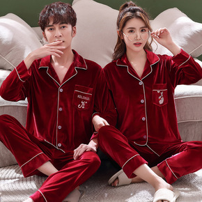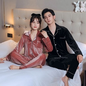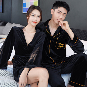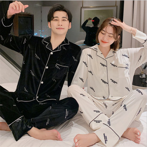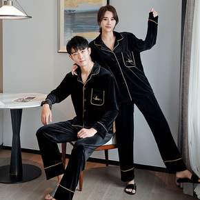 时尚情侣睡衣长袖金丝绒韩版开衫男士纯色家居服女秋冬...