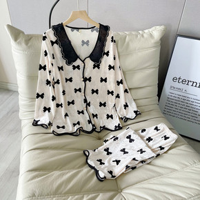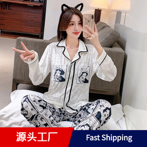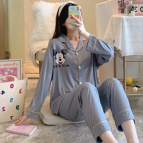 春秋季睡衣女翻领开衫宽松卡通可爱休闲长袖长裤家居服...