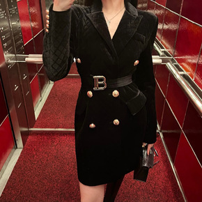 B家西装领连衣裙收腰秋冬棉衣丝绒菱格夹棉黑色中长款...