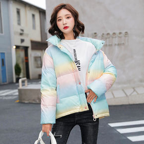 羽绒棉女2021新款白鸭绒短款渐变色彩虹宽松面包服...