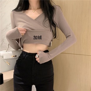 双面德绒保暖自发热-秋冬新款修身显瘦交叉绑带露脐纯...