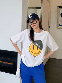 姐自制 笑脸T 230克全棉紧密双纱绒圆领撞色印花...