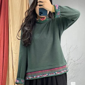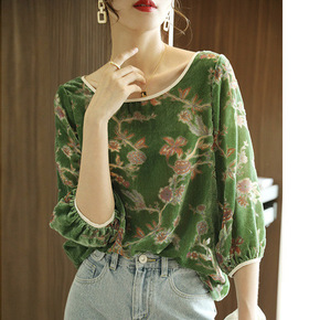 真丝绒新款上衣女秋季七分袖圆领洋气宽松绿色复古桑蚕...