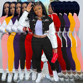 SM9213欧美女装纯色拼接螺纹字母印花口袋棒球服...